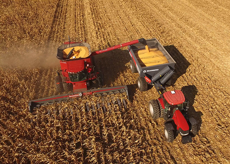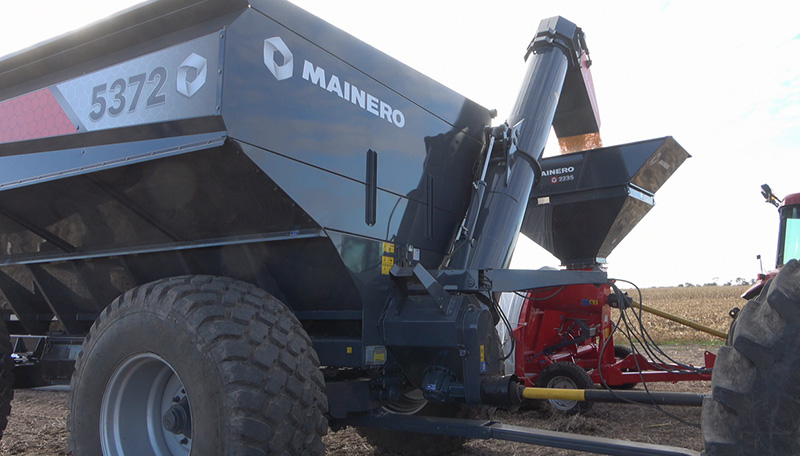 Tolva autodescargable “Mainero” de 37.000 lts. - 28/30 tn. capacidad de carga, para ser accionada por tractor de 135 HP de potencia con toma de fuerza a 540 rpm. y doble circuito hidráulico doble efecto y circuito eléctrico 12 V.